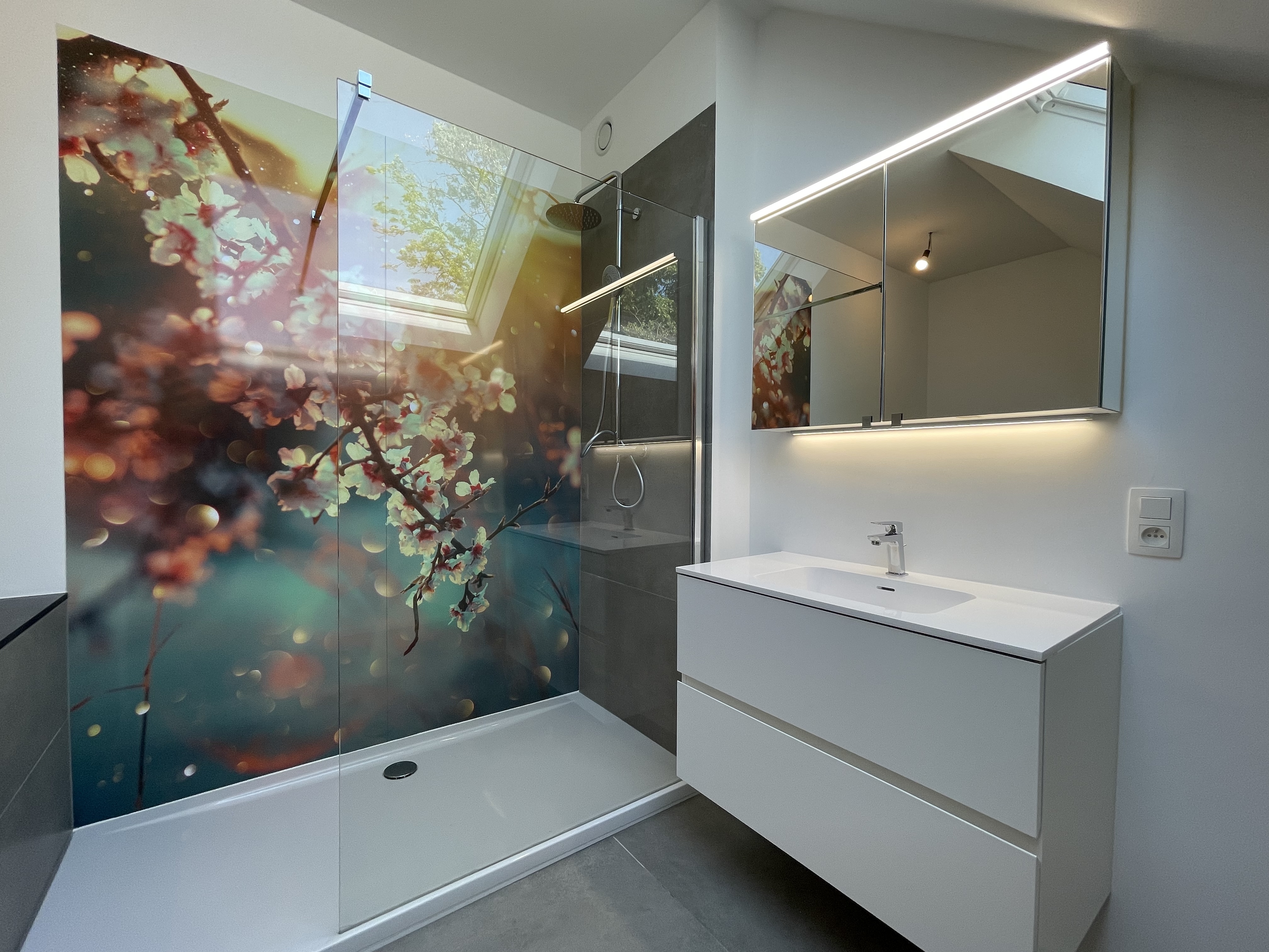 - Salle de bains: 15.68m², carrelage, douche, meuble lavabo avec miroir éclairé