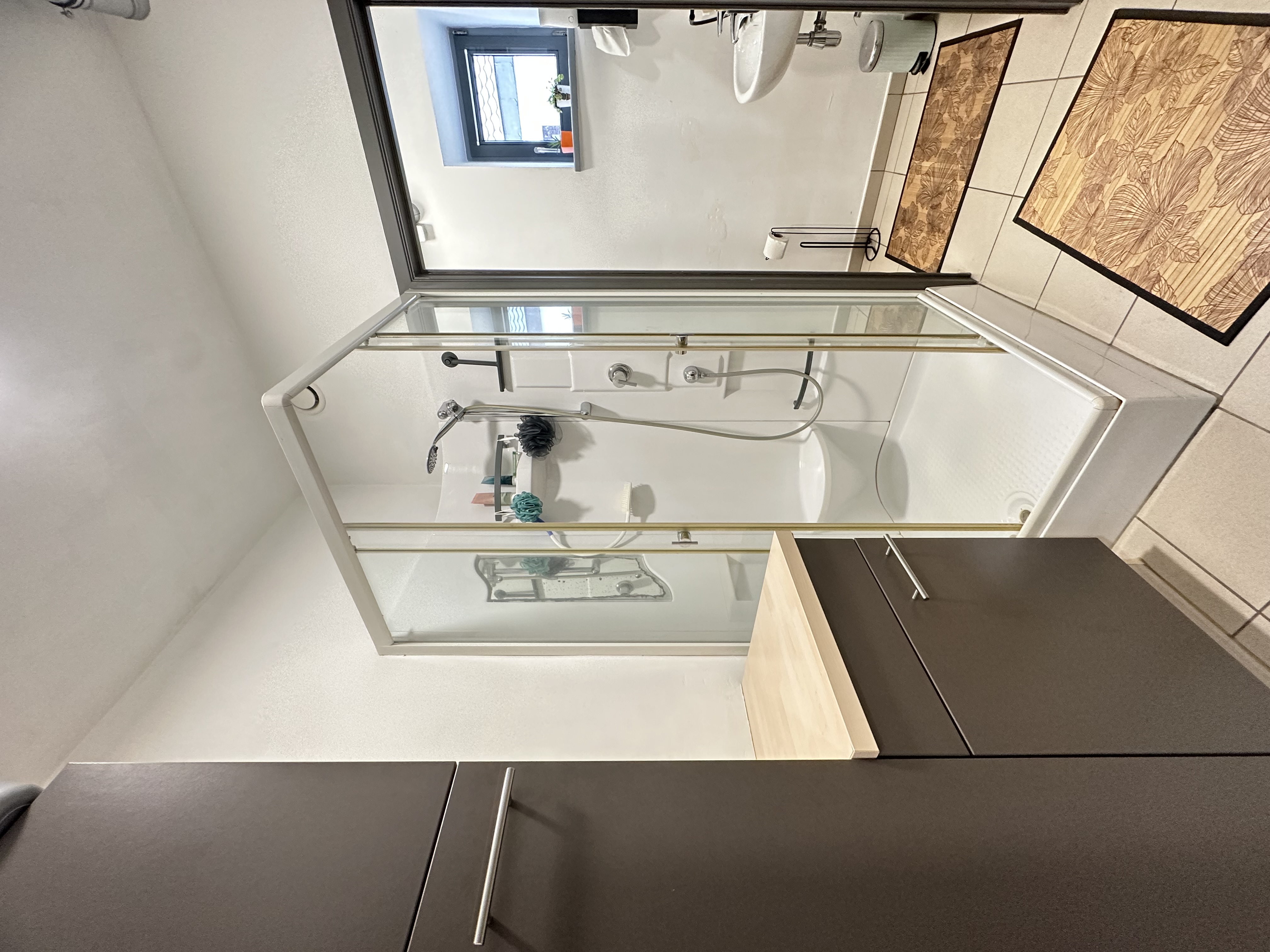 Salle de douches: (1.79x1.97) 3.52m², carrelage, cabine de douches, lavabo et miroir, emplacement machine à laver et séchoir