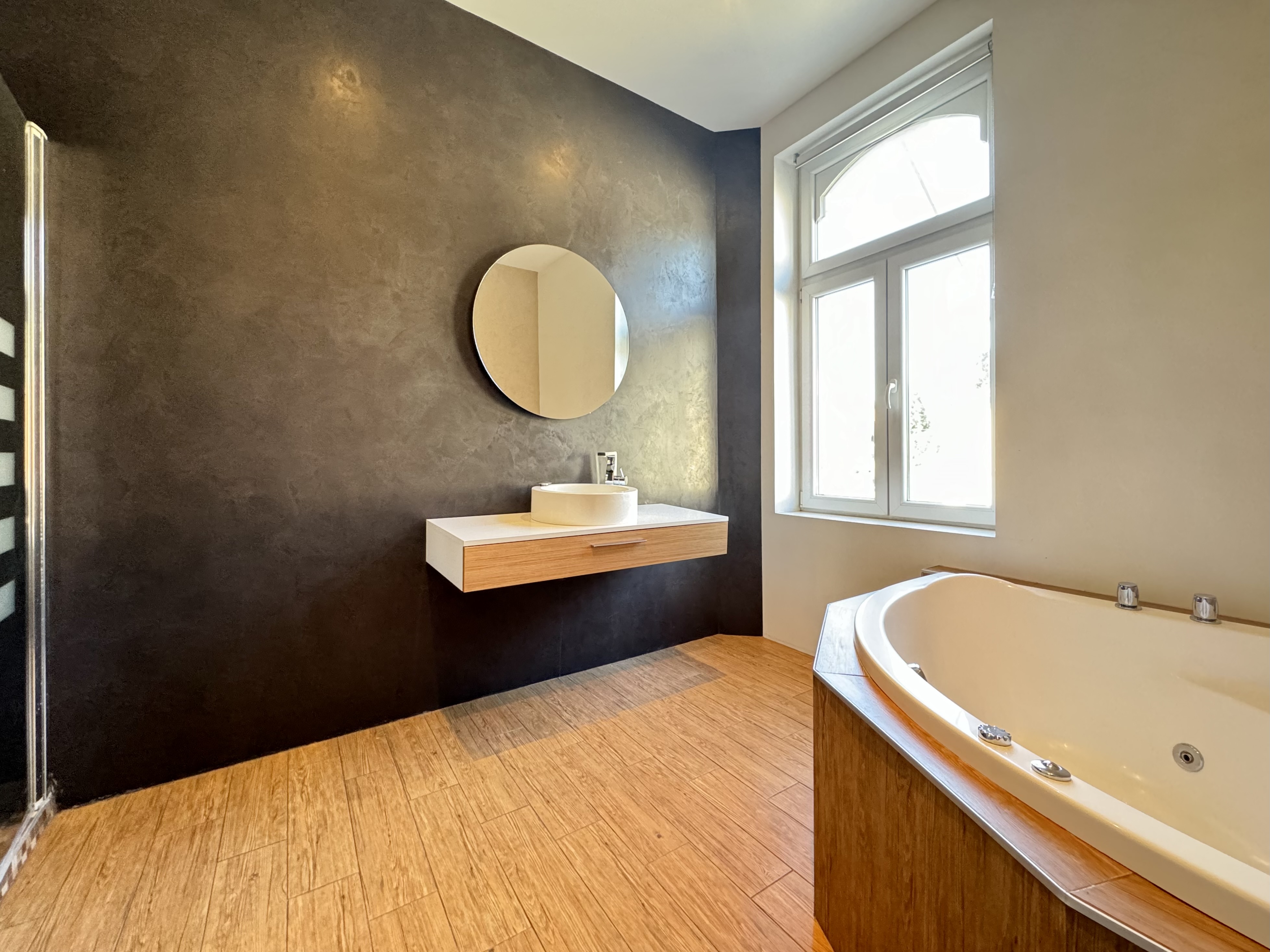 - Salle de douches: (3.39x2.5) 8.45m2, carrelage, meuble double vasque, wc suspendu, douche à l’italienne, sèche-serviettes