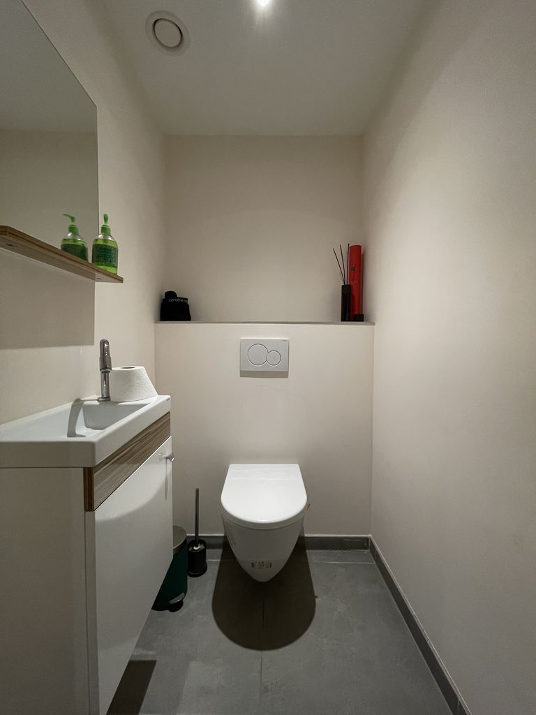 - WC séparé: (1.39x1.16) 1.61m2, carrelage, WC suspendu Geberit, meuble lavabo