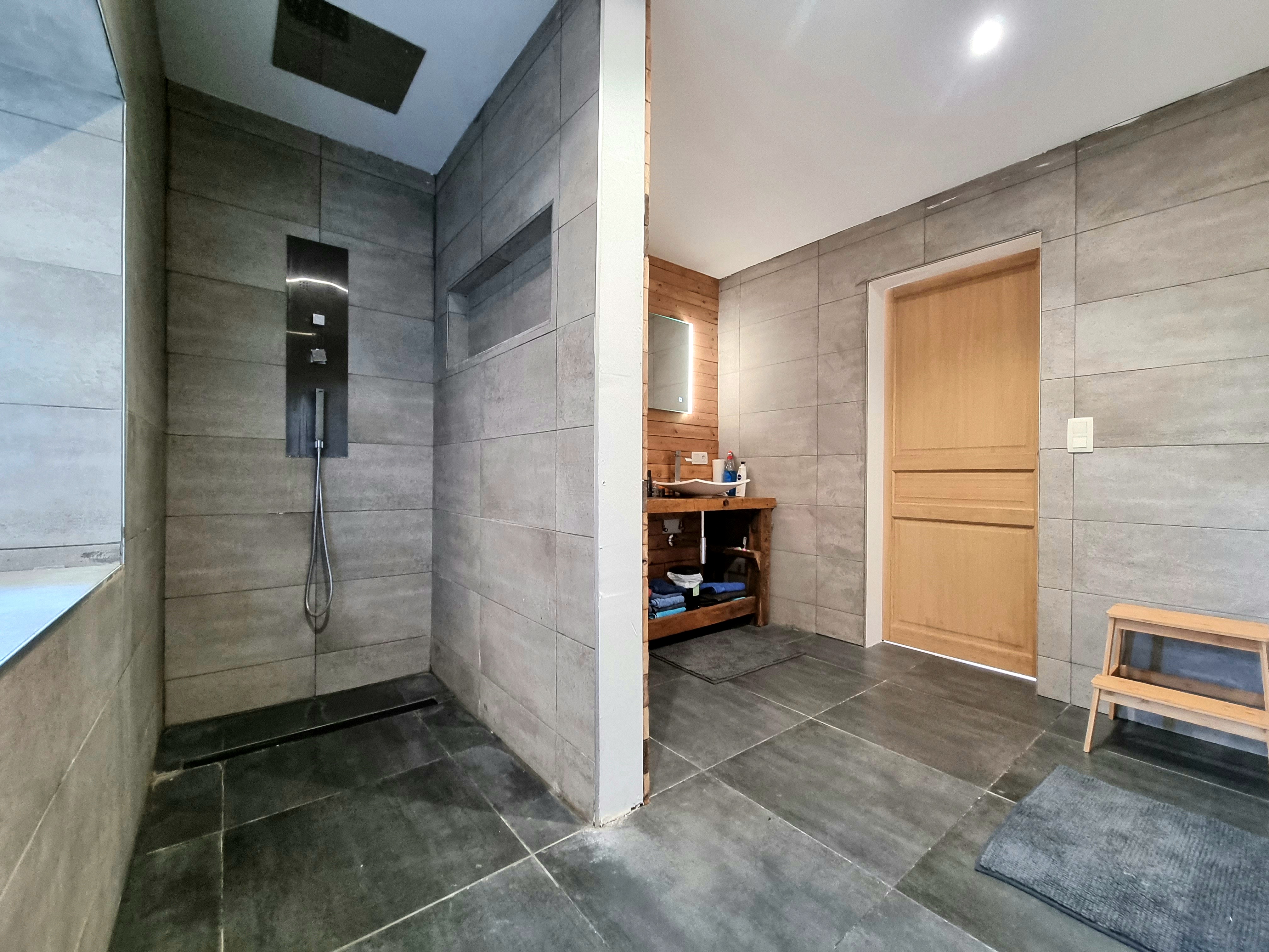 - Salle de bains : (3.80x3.05) 11.59m², carrelage, meuble avec double vasque, baignoire, douche italienne, Wc