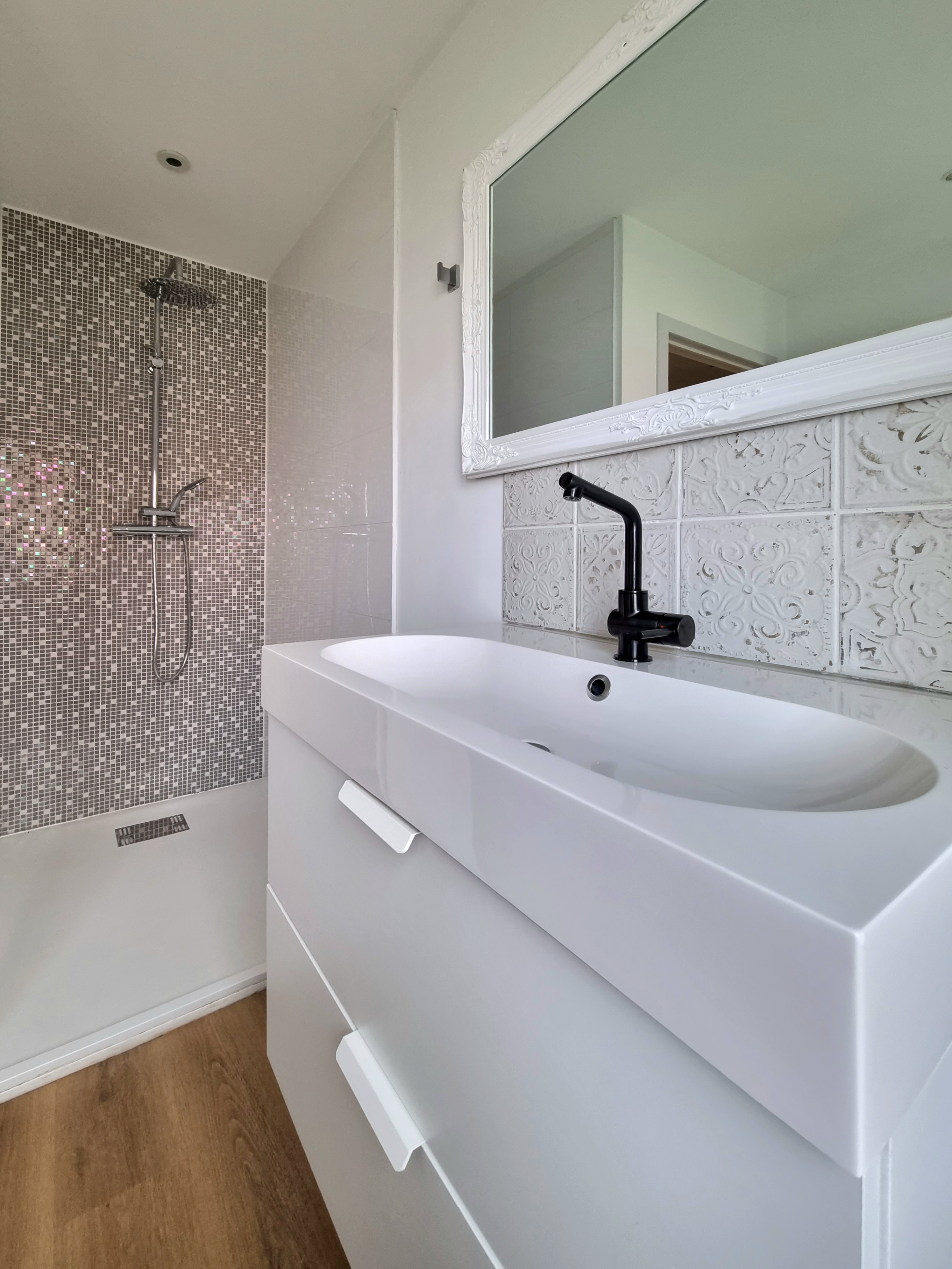 - Salle de douches : (2.05x1.71)+(1.25x0.89) 4.62m², parquet, douche italienne, meuble lavabo avec miroir