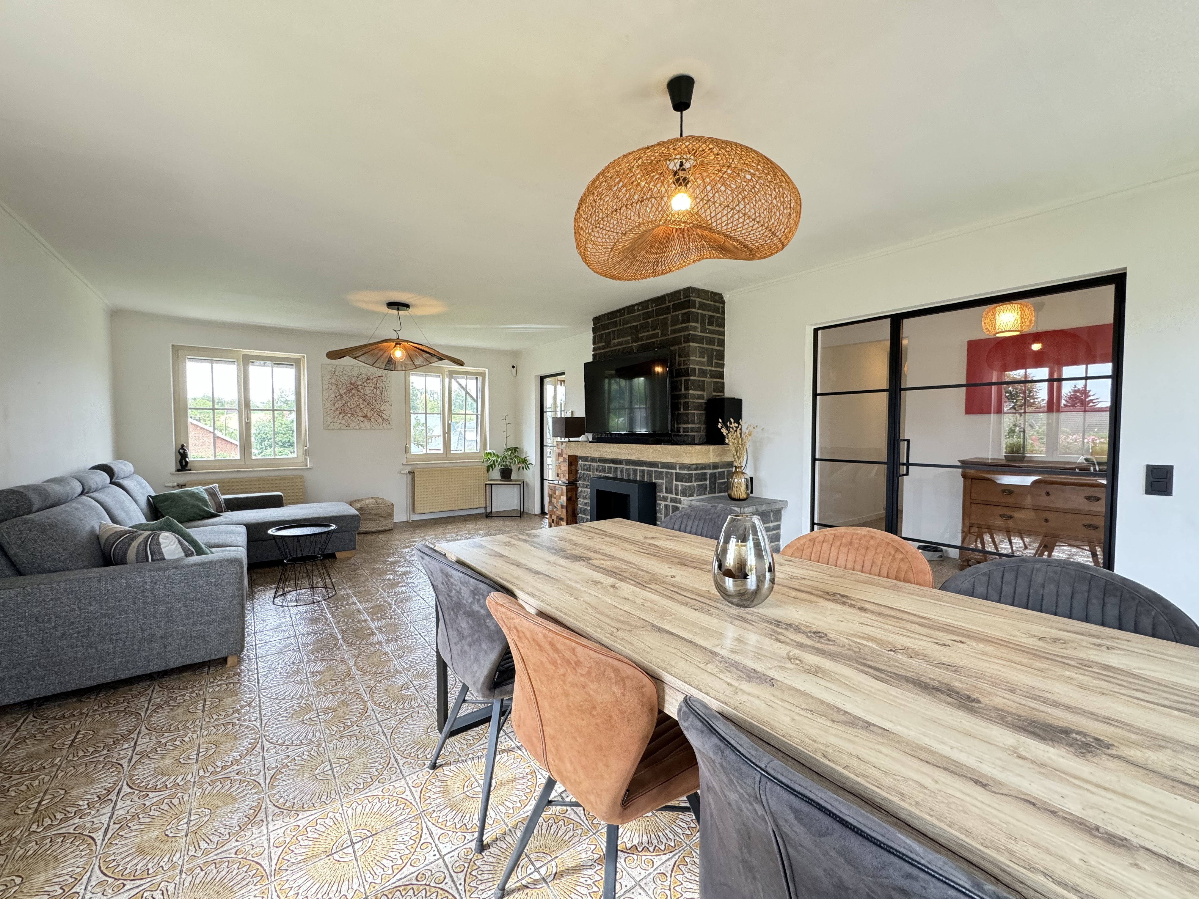 - Salon: (4.49x7.68) 34.94m², carrelage, cheminée en pierre bleue, poêle à l’éthanol