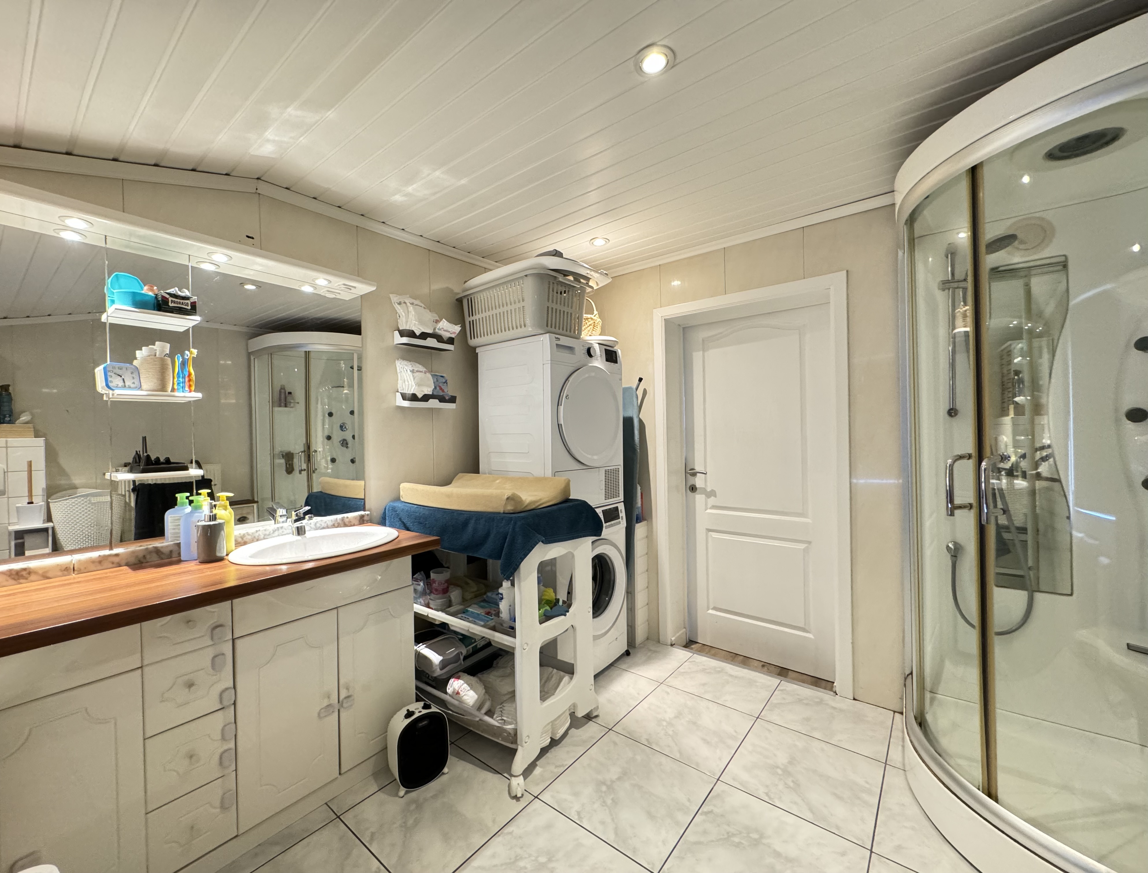 - Salle de douches: (2.81x2.80) 7.91m², carrelage, douche, wc suspendu, emplacement MàL et séchoir, lavabo sur meuble, armoire pharmacie