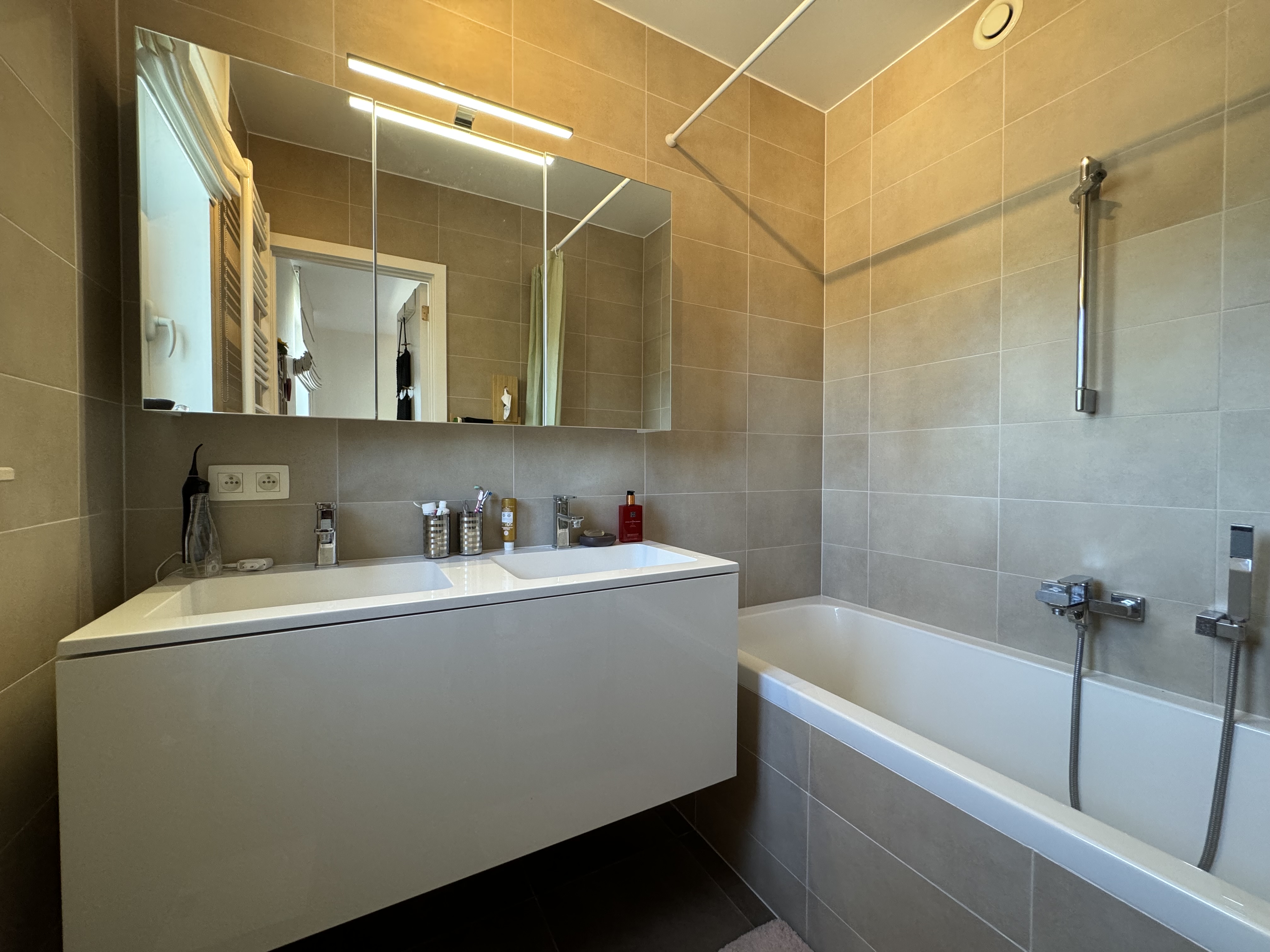 - Salle de bains : (1,86x2,15) 4,02m², carrelage, baignoire, meuble double lavabo, radiateur sèche serviette