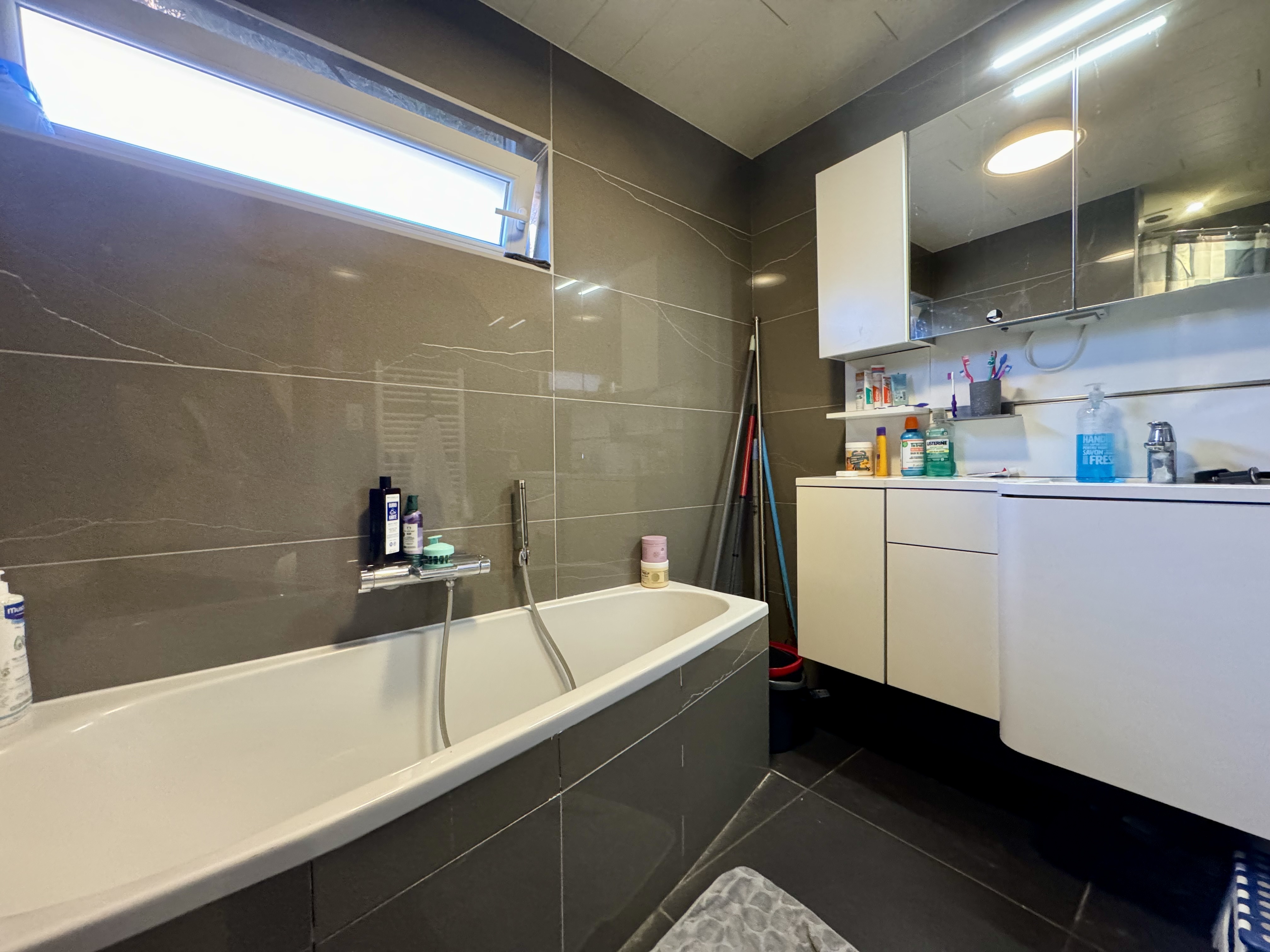 - Salle de bains: (1.70x3.30) 5.61m², carrelage, baignoire, douche, meuble lavabo