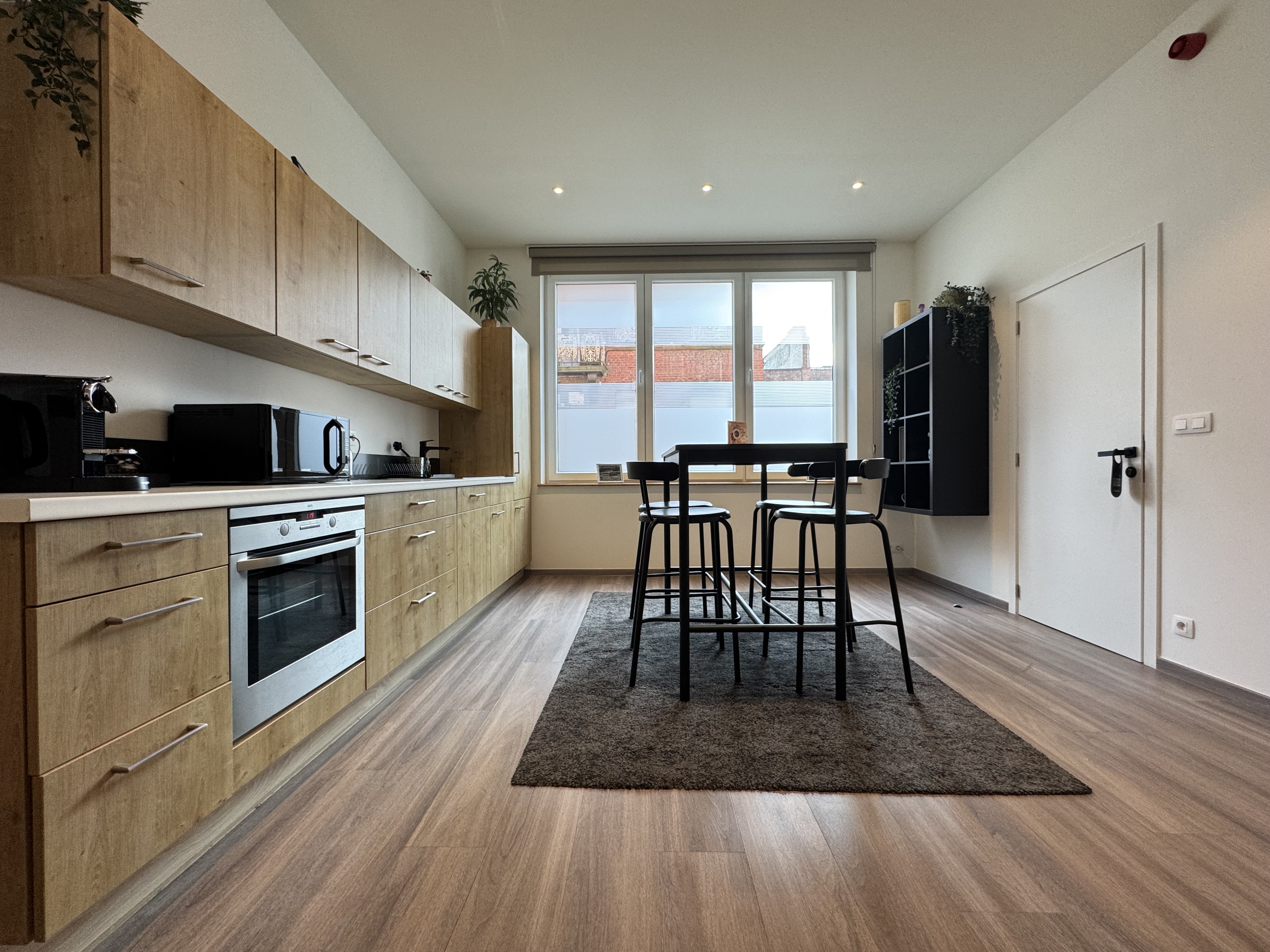 - Séjour: (7.15x3.68) 27.71m2, luxurious vynil tiles, cuisine équipée, four, micro-ondes, frigo, grille pain, évier, machine à café
