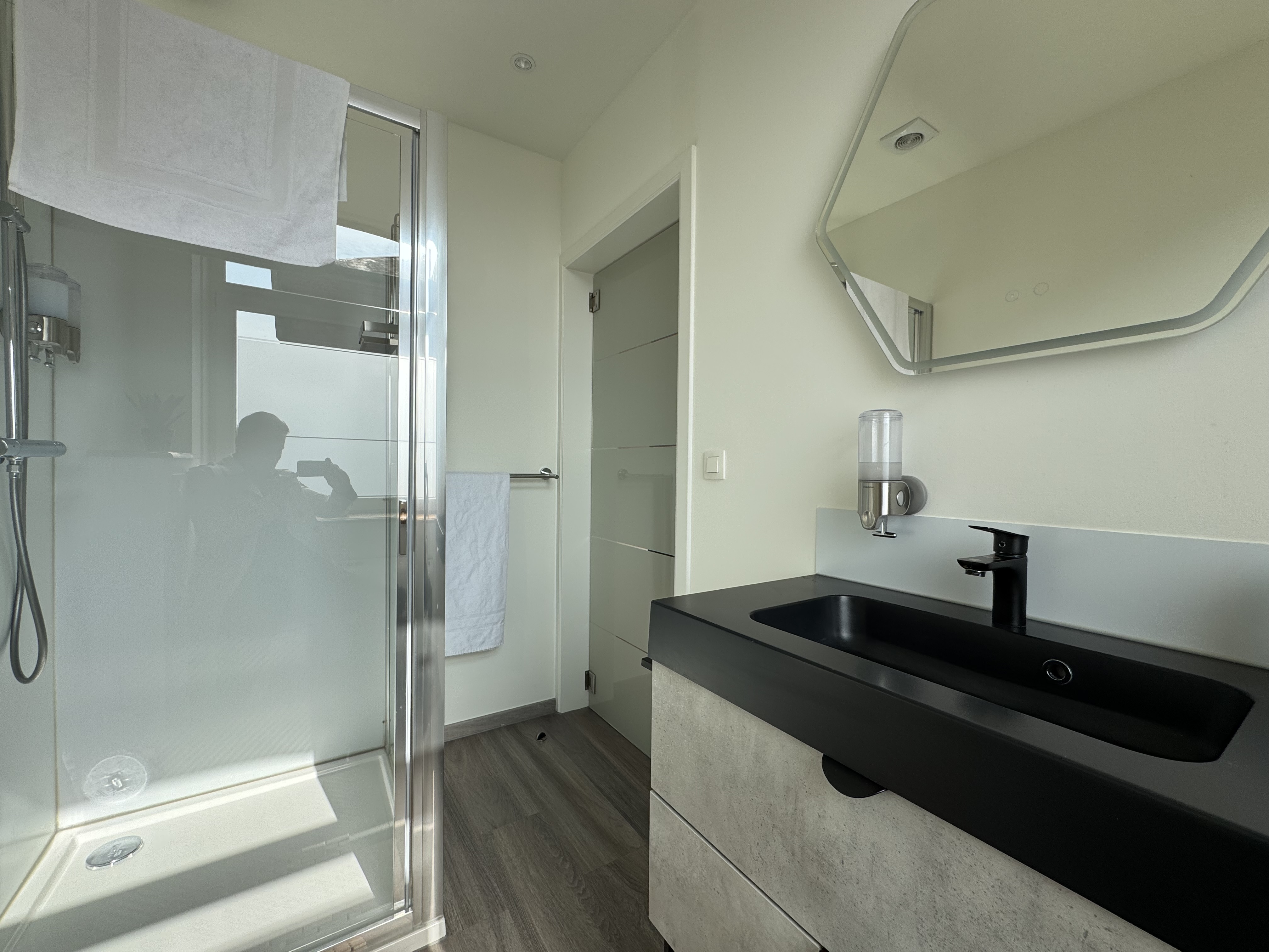 - Salle de douches: (2.95x2.24) 6.22m2, luxurious vynil tiles, meuble double lavabo, miroir éclairé, colonne, wc suspendu Geberit, douche avec paroi vitrée