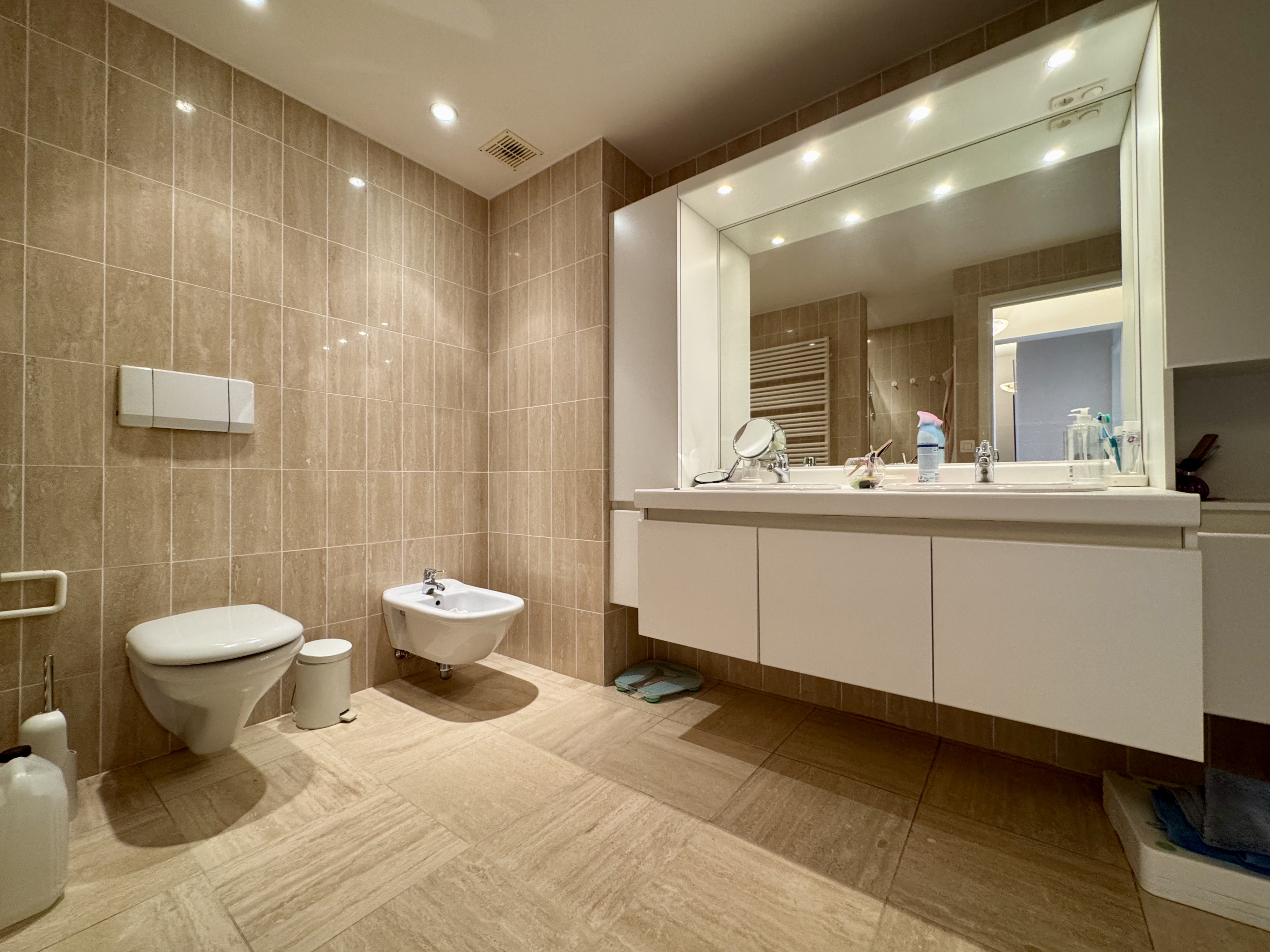 - Salle de bains: (2.13x3.55) 7.57 + 1.74 = 9.30m2, marbre, meuble double lavabo avec 2 colonnes, miroir éclairé, baignoire, douche, wc suspendu, bidet, sèche-serviettes, aérateur