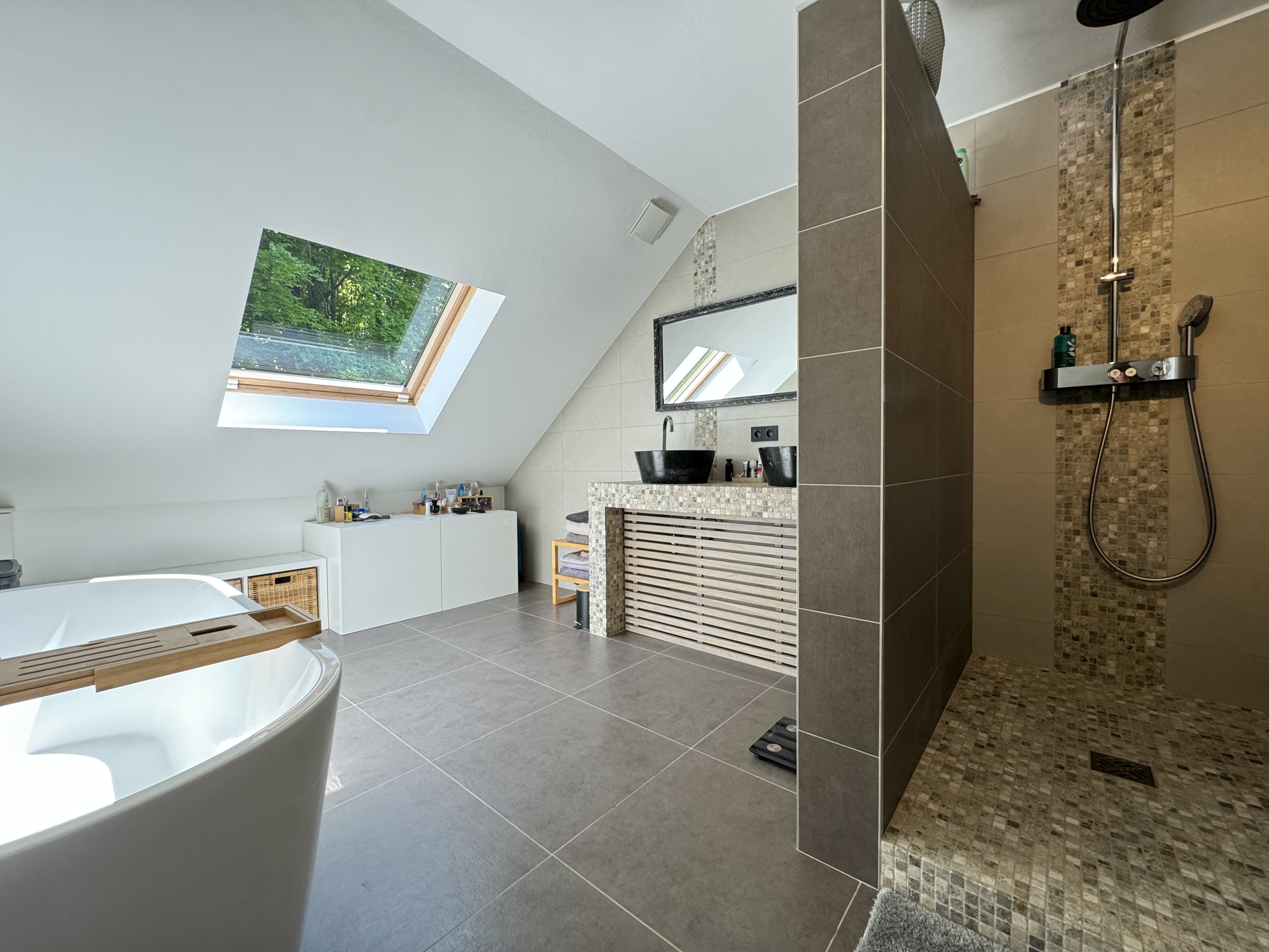 • Salle de bains: (4.26x3.00) 12.78m2, douche à l’italienne, robinetterie avec effet pluie Hansgrohe, baignoire îlot, tablette double vasque en pierre