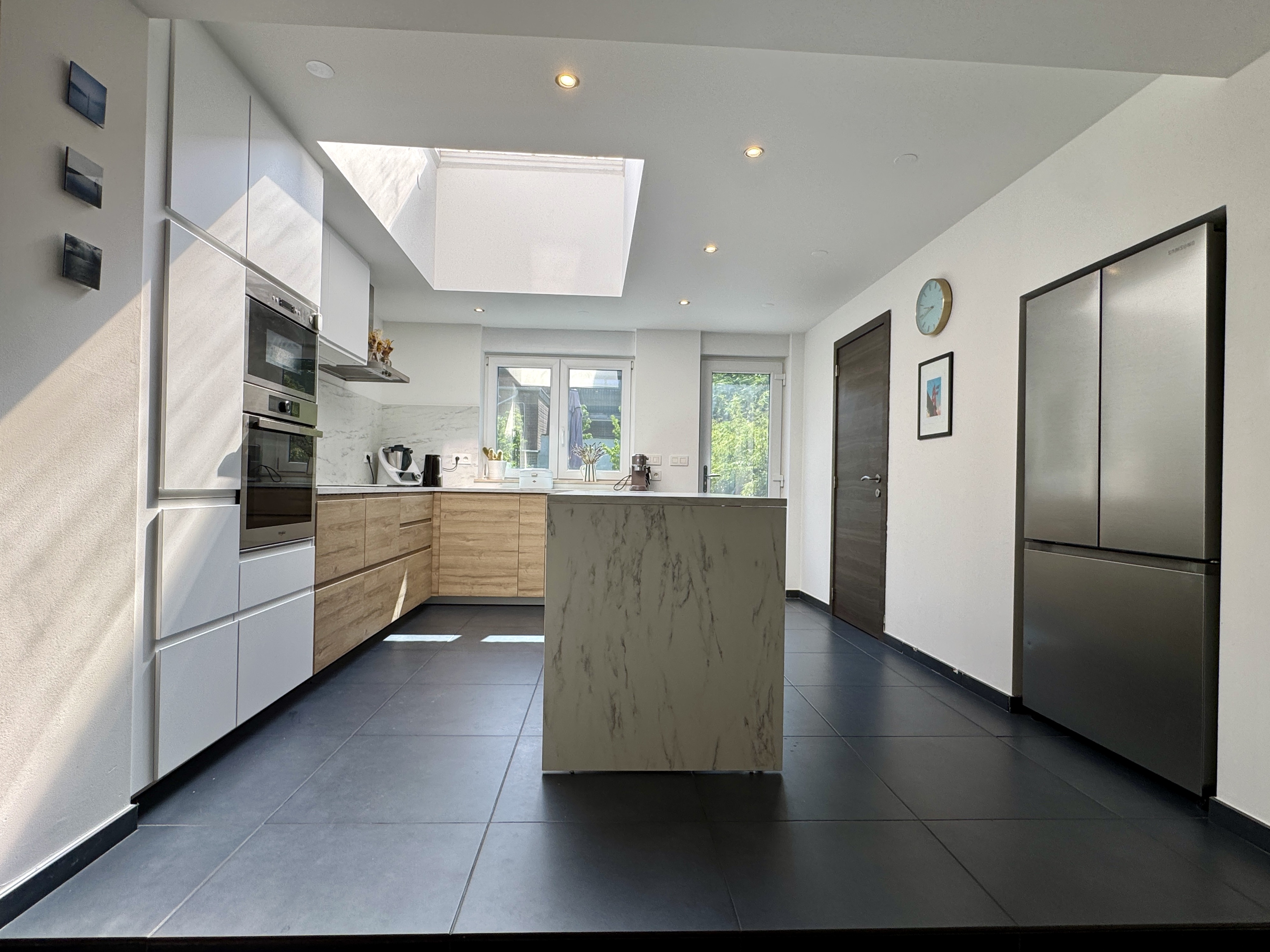 - Séjour avec cuisine US hyper équipée: (4.07 x 13.50) 54.94m2, carrelage, visiophone, four, micro-ondes, évier, lave vaisselle, taque à induction 4 points, hotte, lave-vaisselle, îlot central, espace dînatoire, frigo américain, accès sur la terrasse et le jardin