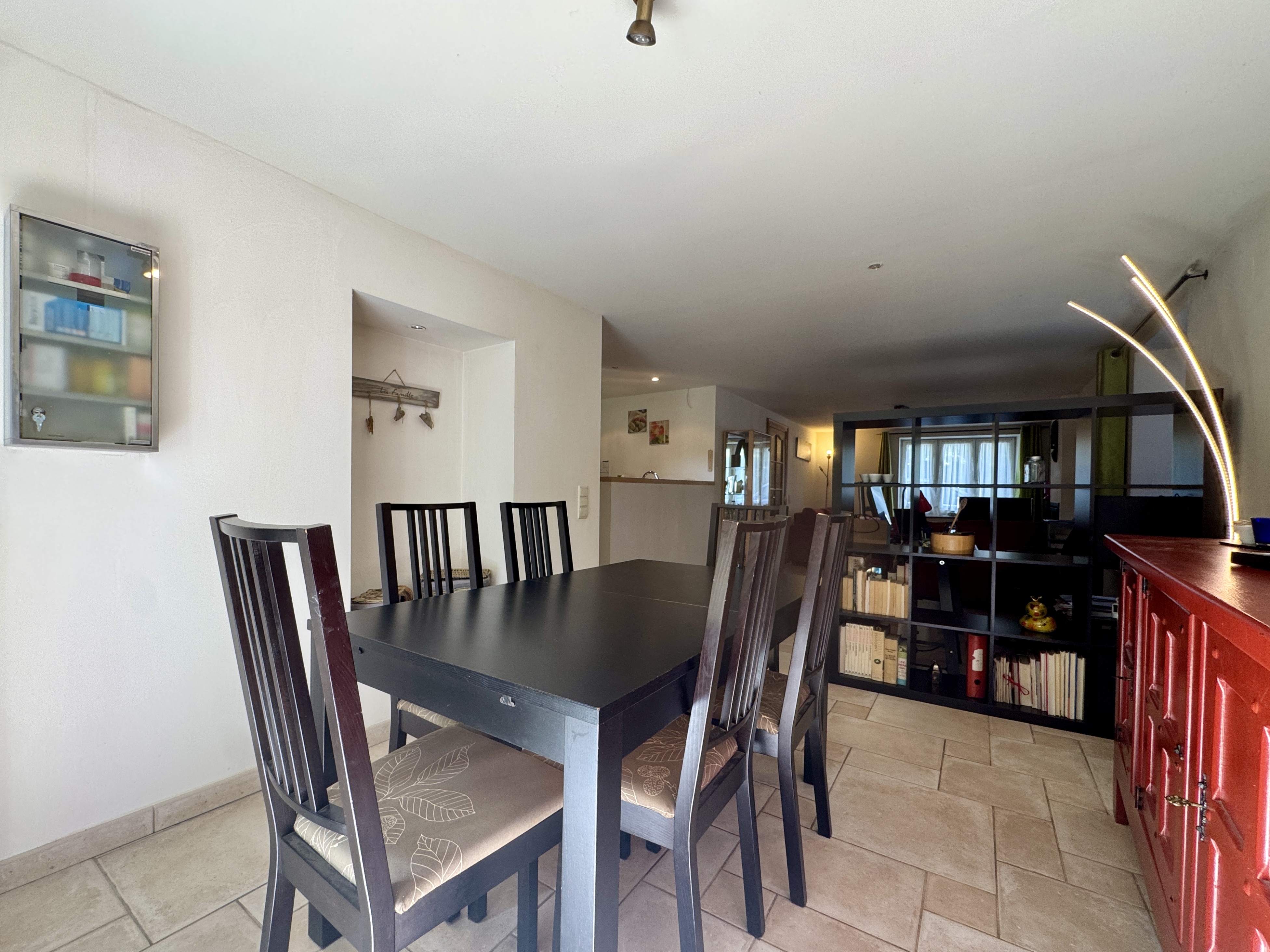 - Cuisine: (3.13x2.33) 7,29m2, carrelage, évier, four, meubles de rangement, lave-vaiselle, hotte, frigo, congélateur 3 bacs, taque vitrocéramique 4 points, accès sur terrasse