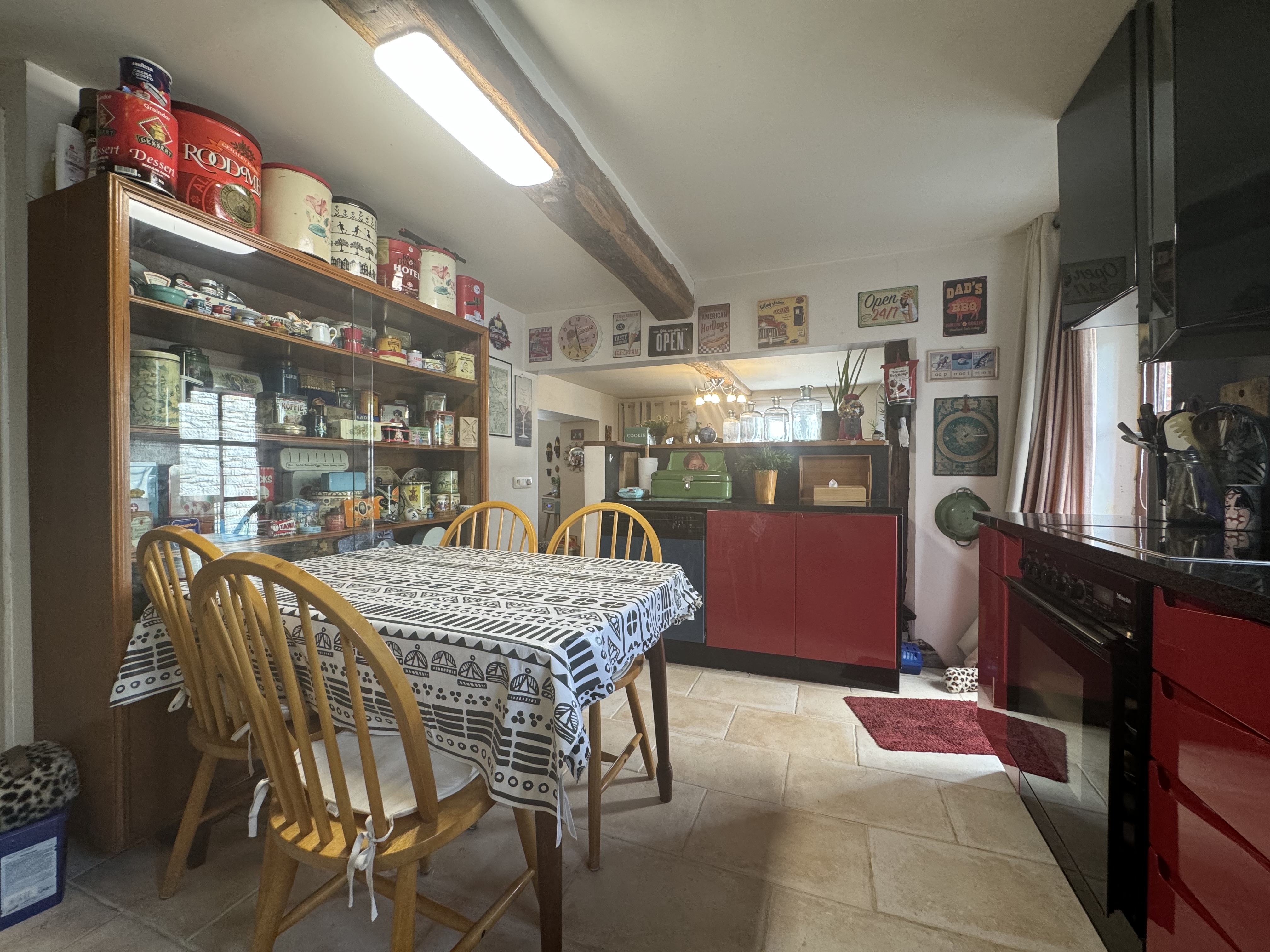- Cuisine équipée: (3.83x3.25) 12.37m2, carrelage, lave-vaisselle, hotte, four, taque vitrocéramique, meuble de rangement
