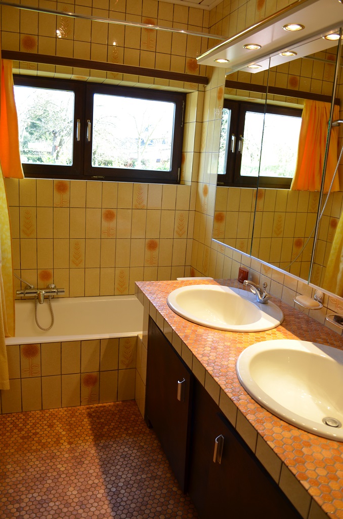 - Salle de bains: (2.63x1.70) 4.47m², carrelage, baignoire, meuble double lavabo, murs carrelés