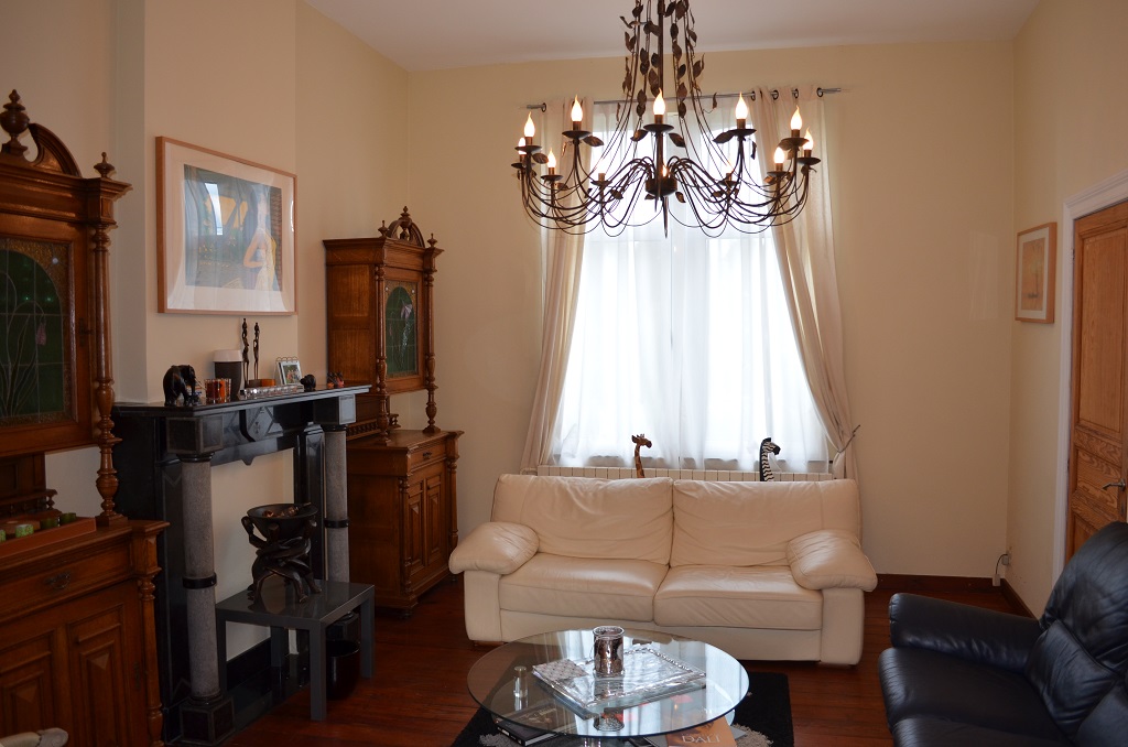 - Séjour: (4.08x9.86) 40.20m², plancher, bow window, 2 cheminées en pierre bleue, 3.50m de hauteur sous plafond