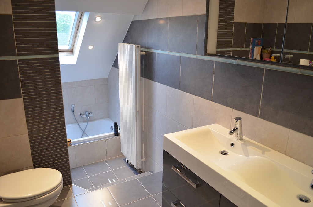 - Salle de bains: (2.82x3.25) 9.18m², carrelage, baignoire design, douche XXL (1.80x0.83) 2 personnes, meuble lavabo avec colonne, wc suspendu Geberit
