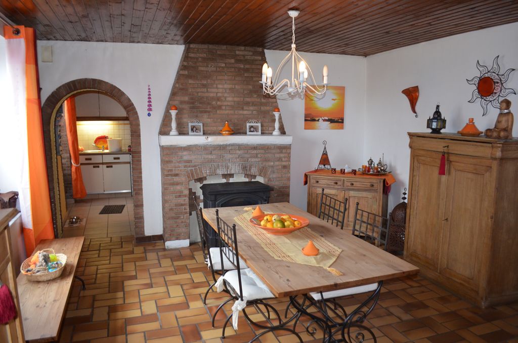- Cuisine: (3.21x4.07) 13.07m², carrelage, évier, taque au gaz (propane) 4 becs, hotte de 90cm, coin repas