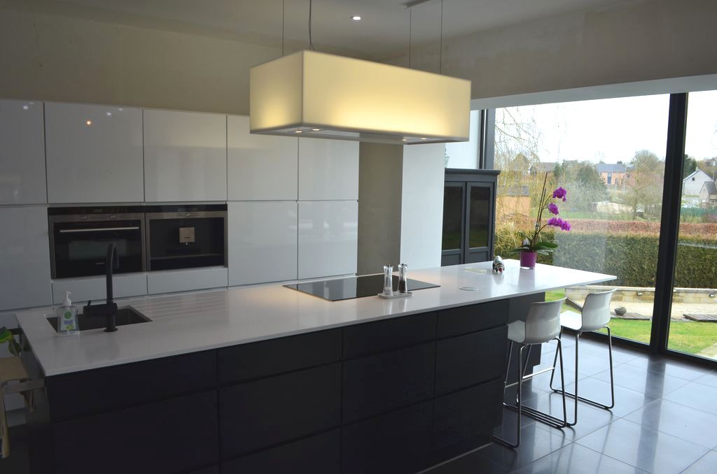 - Cuisine hyper-équipée: (3.67x4.39) 16.14m², carrelage, vaste îlot central avec espace dinatoire, plan de travail en granit recomposé, hotte centrale Novy, taque induction, four électrique, machine à café encastrée, lave-vaisselle, frigo, évier, meubles de rangement, accès sur la terrasse et le bow window