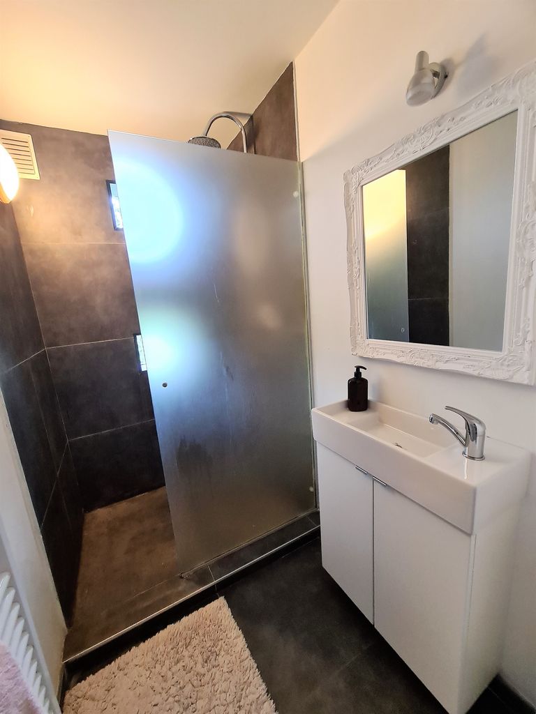 - Salle de douches: (2.00x1.35) 2.70m², carrelage, douche à l'italienne, meuble-lavabo avec rangements, sèche-serviettes