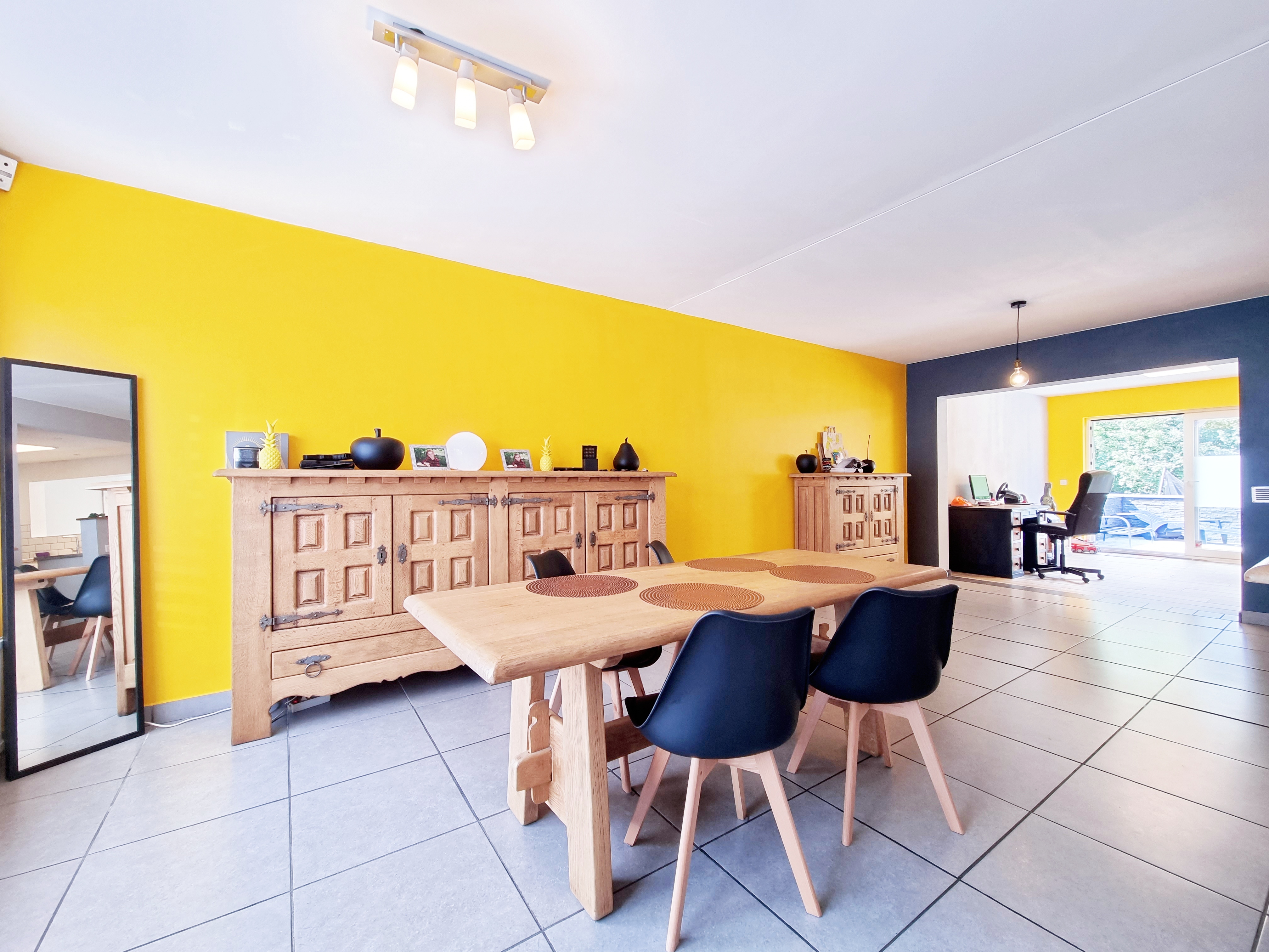Vous profiterez d'un agréable espace de vie lumineux de ± 50m² avec accès sur la terrasse et cuisine ouverte entièrement équipée. Cette habitation dispose de tout le confort moderne à savoir, un système d'alarme, une isolation complète, du béton entre les niveaux, un chauffage central avec nouvelle chaudière à condensation, 2 poêles à pellets, des châssis en PVC double vitrage, une installation électrique conforme, une terrasse bien orientée avec tente solaire, un jardin offrant une vue sur les bois, un garage avec accès à la buanderie et 4 emplacements de parking.