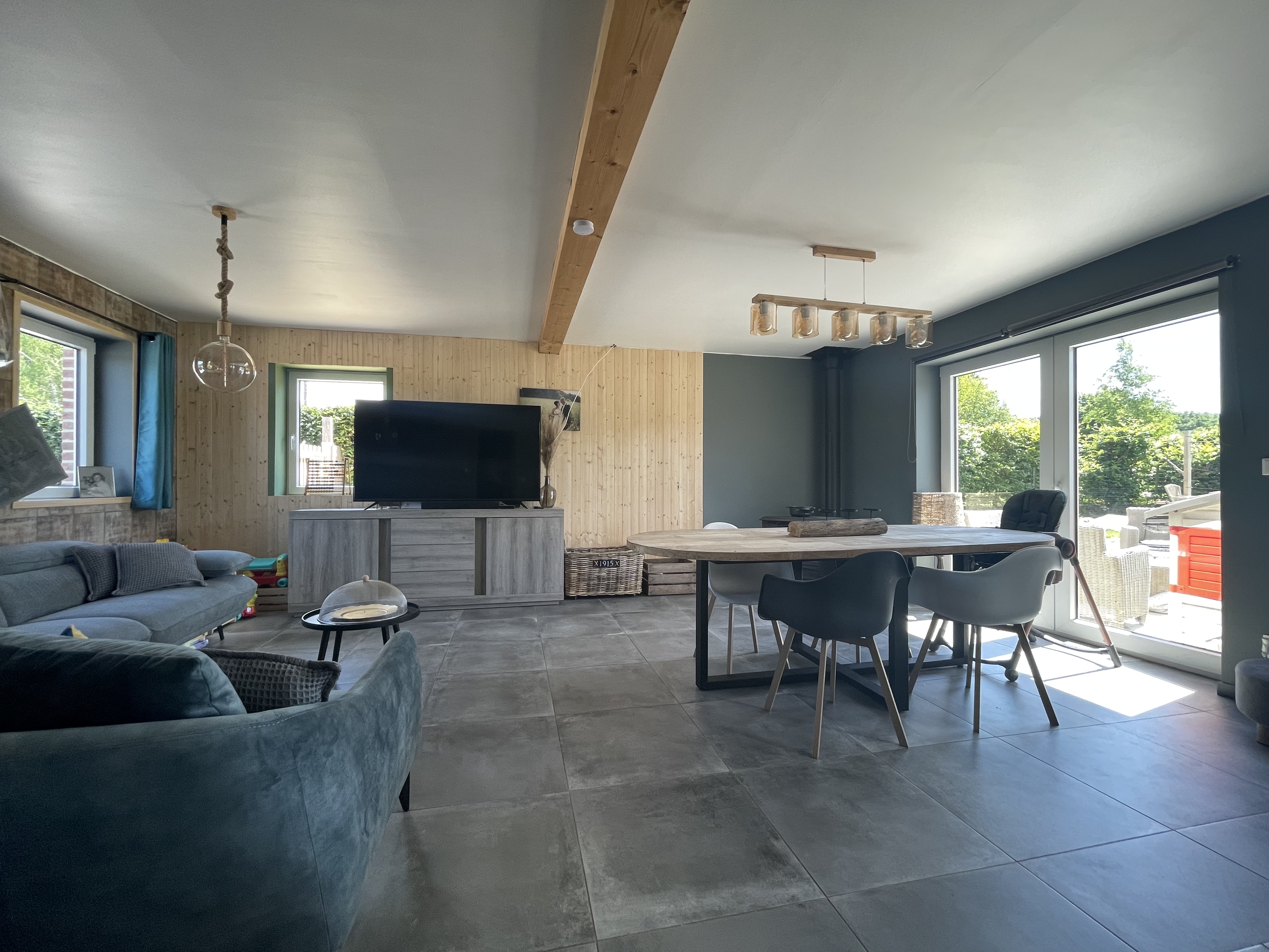 - Living: (6.39x5.36) 34.25m², carrelage, poêle à bois, accès sur extérieur