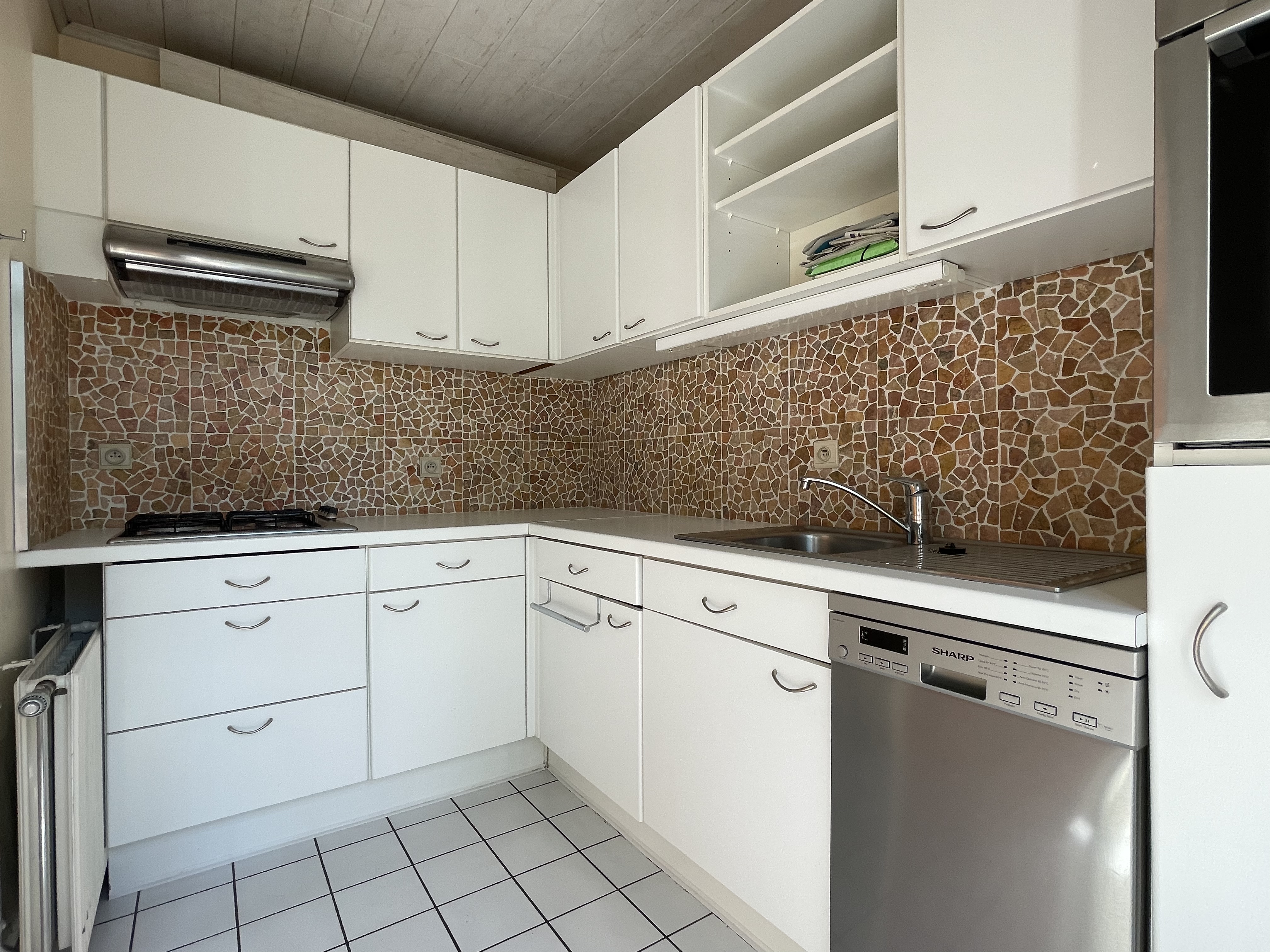 - Cuisine équipée : (2.85x1.82) 5.18m², carrelage, meubles hauts et bas, évier + égouttoir, frifo, four, hotte, lave vaisselle, taque au gaz